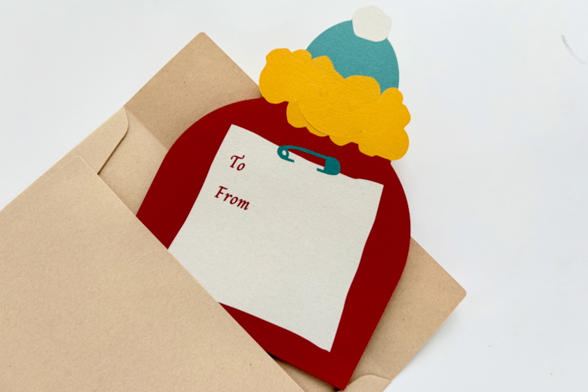 カードを、閉じたり開いたりすると、腕が動いて編み物を編んでるような動作になります。開いた状態で、机の上に置いたり、穴を開けてクリスマスツリーに飾っても素敵です。