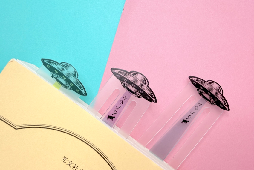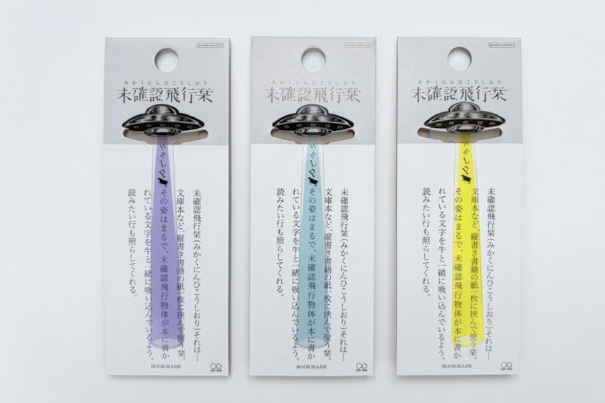 サンスターより、ユニークな栞が届きました。 その名も、未確認飛行栞。 本に書かれている文章と牛を一緒にUFOが吸い込んでいるように見える 楽しい栞です。 UFOから出るビームで、文章の行も照らしてくれるので、スタートする行まで導いてくれます。 本の上をスライドすれば、UFOが動いているように見えますよ。